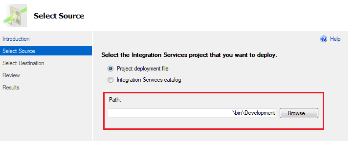 What kind of Integration Services project do you want to deploy? Since we are dealing with an ISPAC file on our local directory we will select the source path we found from Step 1. Simply browse to the path location and click ok.